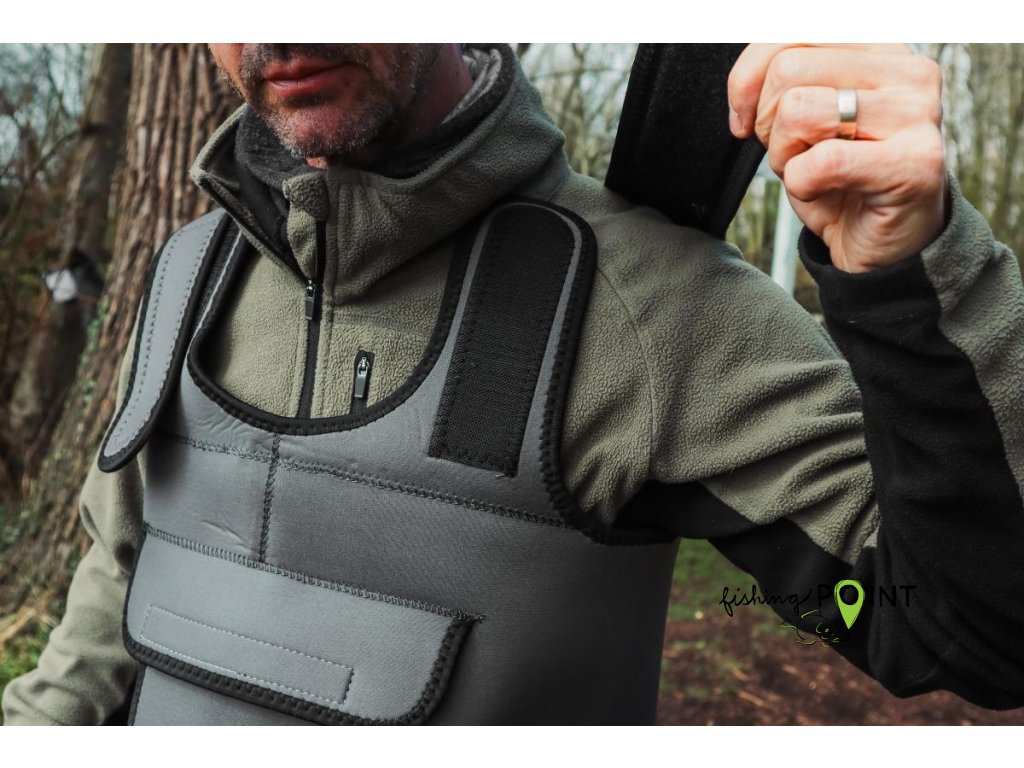 Neoprenové prsačky TROPHY Neoprene Chest Waders jsou odolné a vyrobené ze 4,5 mm silného neoprenu. Neopren velmi dobře izoluje teplo, což vám umožní zůstat v chladnější vodě ještě déle. jsou vybaveny pevnými gumovými botami, které jsou připevněny k samotným prsačkám. Na kolenou jsou další výztuhy pro větší pohodlí i bezpečnost, pokud si potřebujete kleknout kvůli focení nebo abyste něco uvázali. Na přední straně je kapsa s klopou pro uložení osobních věcí, telefonu, klíčů, kleští nebo drobného vybavení. Prsačky mají v horní části ramenní popruhy, takže umožňují bezproblémový pohyb pro aktivní rybolovné techniky.