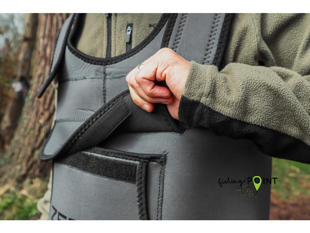 Neoprenové prsačky TROPHY Neoprene Chest Waders jsou odolné a vyrobené ze 4,5 mm silného neoprenu. Neopren velmi dobře izoluje teplo, což vám umožní zůstat v chladnější vodě ještě déle. jsou vybaveny pevnými gumovými botami, které jsou připevněny k samotným prsačkám. Na kolenou jsou další výztuhy pro větší pohodlí i bezpečnost, pokud si potřebujete kleknout kvůli focení nebo abyste něco uvázali. Na přední straně je kapsa s klopou pro uložení osobních věcí, telefonu, klíčů, kleští nebo drobného vybavení. Prsačky mají v horní části ramenní popruhy, takže umožňují bezproblémový pohyb pro aktivní rybolovné techniky.
