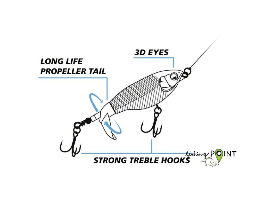 Speciální funkce: ocas vrtule s dlouhou životností vytváří nízkofrekvenční tlakové vlny a nezaměnitelný „plop“ zvuk na hladině