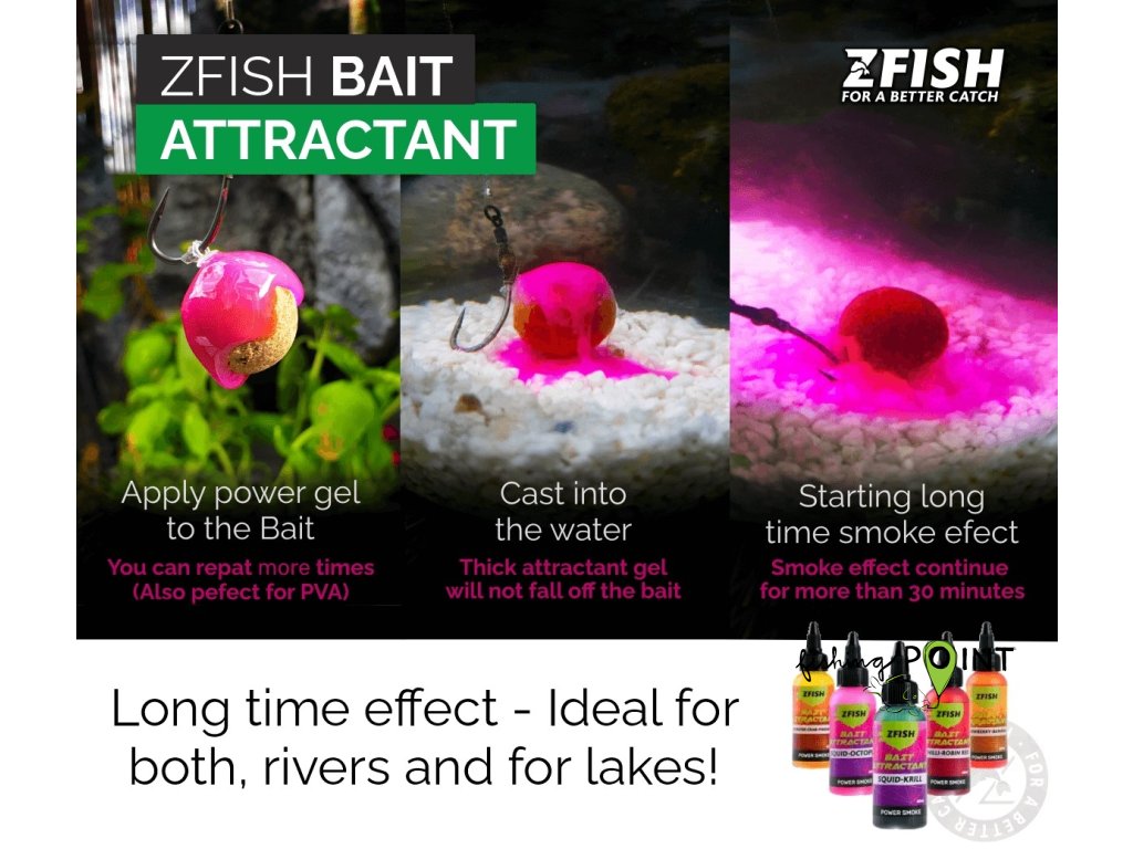 ZFISH Bait Attractant je náš nový revoluční dip, který dodává nástrahám onu třešničku na dortu! Jeho hustota zajišťuje, že neopadává a že se rozpouští déle než běžné tekuté dipy. Ve vodě vytváří skutečný harmonický oblak, který se rychle šíří po okolí, a tím rychleji přiláká ryby na náš háček! Aromatický oblak, který vzlíná z nástrahy, prostě musíte vidět, abyste uvěřili a právě proto je náš Bait Atractant tak revoluční. Obsahuje pečlivě vybrané a vyvážené komponenty, atraktory a chuťové stimulátory, které u ryb velice účinně podporují apetit a dokáží je přilákat k nástraze ať už jsou kdekoli ve sloupci. Dip lze použít také do spod mixů, jako přídavek do práškového krmení a skvěle se osvědčil na feederových a kaprařských závodech! Lze jej používat po celý rok a navíc nerozpouští PVA materiály. Dostupný je v 5-ti stejných příchutích jako většina našeho krmného programu.Revoluční DIP o vyšší hustotě