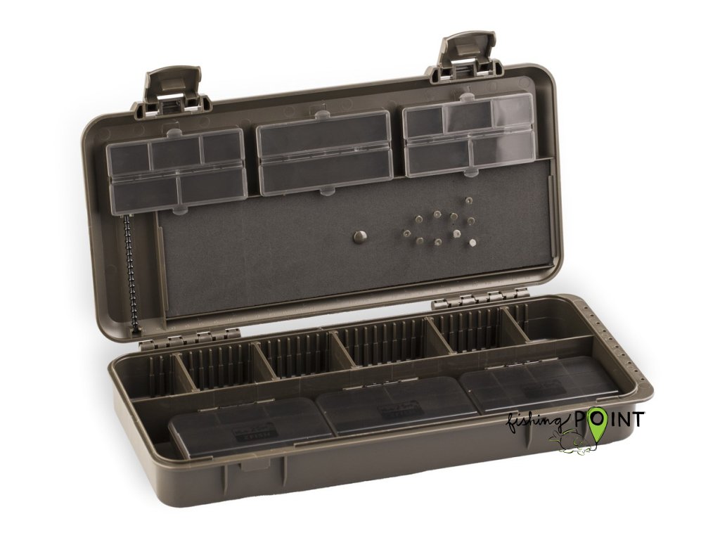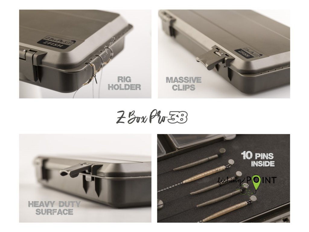 ZFISH Z-Box PRO 38 je praktický a univerzální tackle box od české značky ZFISH. Tento šikovný organizér je kompaktnější verzí modelu PRO 45 a disponuje 38-mi přihrádkami z nichž většina je nastavitelná díky vyjímatelným přepážkám. Bezpečné uzavření a nechtěné otevření zajišťují dva bytelné aretační klipy. Víko organizéru je opatřeno robustními, uzavíratelnými přihrádkami a dále nabízí kompletní zásobník na návazce s hrazdou pro háčky, pěnovou částí o velikosti 270 x80 mm a 10-ti kusy špendlíků a integrovaným pravítkem. Další vychytávkou u tohoto konkrétního modelu tackle boxu je integrovaná děrovaná lišta pro zavěšení hotových montáží umístěná na jedné z kratších stran spodní části boxu. Celkové rozměry boxu jsou 350 x165 cm s hloubkou 50 mm, takže spolehlivě pojme drobnou bižuterii včetně pomůcek pro samotné vázání návazců a montáží, jako jsou nůžky, kleště, jehly, utahovače uzlů apod. Nadstandartní výbavou tohoto pořadače jsou další 3 menší samostatné krabičky o velikosti 102 x 80 x 24 mm s 4, 6 a 8-mi přihrádkami. Jednoduchý a čistý design se zkosenými a oblými hranami nejen skvěle vypadá, ale díky oblým tvarům je i samotná manipulace mnohem příjemnější. Celkově výborný dojem už jen podtrhují odolné materiály, jednotlivé komponenty ve velmi elegantním, temně olivově zeleném provedení. Tento organizér využijete při většině rybolovných technik, především však při kaprařině a feederu.