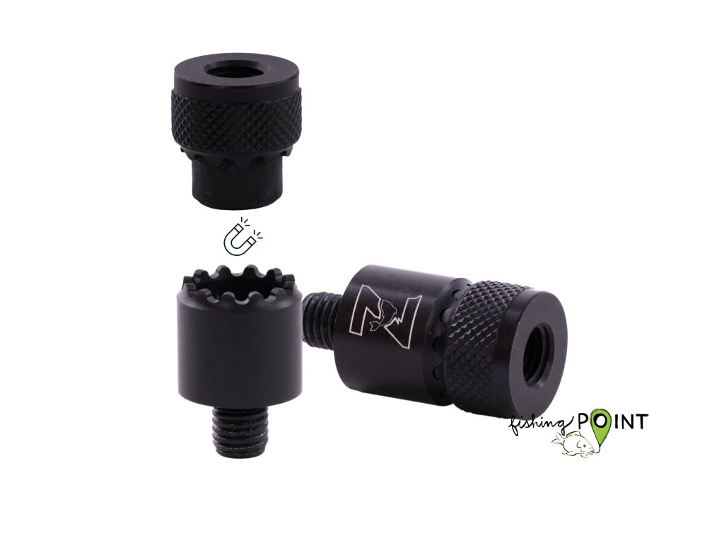 Jedinečná a vychytaná rychlospojka, která funguje za pomoci EXTRA silného magnetu a speciálního tvaru spoje, který do sebe přesně pasuje a zaručuje, že se části rychlospojky nebudou protáčet a sami se nerozpojí ani při prudkém záběru do strany. Do horní části spojky jednoduše našroubujte hlásič a spodní část klasicky namontujte na Váš stojan nebo vidličku a je to. Po ukončení rybolovu jednoduše oddělíte a jednotlivé části ponecháte jak na hlásiči tak na stojanu/vidličce. Při další výpravě stačí jen opět spojit a jste ušetřeni otravného a zdlouhavého šroubování. Spojka je celokovová, kvalitně zpracovaná s černou matnou povrchovou úpravou. Standartní závity pasují na většinu běžných rybářských stojanů a vidliček.Jednoduchý, ale přesto velmi praktický adaptér s EXTRA silným magnetem