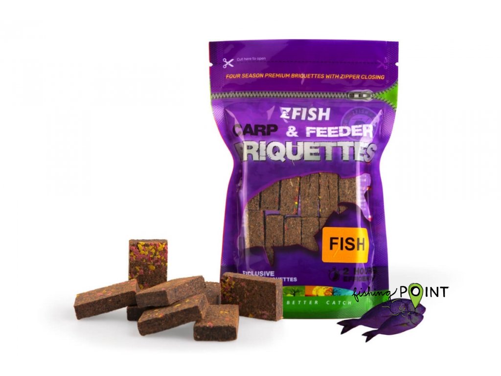 ZFISH Briquettes jsou žhavá novinka v našem krmném programu. Jedná se o velmi kvalitní a tlakově slisovaný, drobný partikl s krmítkovou směsí a anglickou vločkou, do tvaru malých kvádrů ( briket ). Obrovskou výhodou těchto “briket” je jejich skutečně pozvolné a pomalé rozpouštění a vytváření hustého a dlouhotrvajícího “oblaku” rozpuštěného krmiva. Samotné použití těchto briketek je velice snadné a univerzální a lze je používat celoročně, jak ve studené tak i teplé vodě. Dá se s nimi velice jednoduše zakrmit či dokrmit a zatraktivnit tak vaše lovné místo mnoha způsoby. Nejjednodušší je briketky samozřejmě ručně naházet, nebo nastřílet prakem, ale dají se bez problému použít do PVA punčošek, nebo například trochu “rozlámat” a přidat jako další složku do Vaší krmné směsi. Jak celé, tak částečně nalámané vydrží na krmném místě opravdu dlouho a díky svému hranatému tvaru a rozměrům ( 45x30x12mm ) je většina ryb nedokáže nasát, takže Vám je z rozkrmeného místa jen tak snadno “nevyluxují”. Tyto vlastnosti rovněž oceníte v proudech, kde briketkám výrazně napomáhají zůstat na požadovaném místě mnohem déle než běžné krmení, protože je proud prostě tak snadno neodnese. Věříme, že kdo je jednou vyzkouší, tak si jejich jedinečné vlastnosti zamiluje a stanou se nedilnou a univerzální součástí jeho krmné strategie.Neobsahuje konzervanty ( fish friendly )